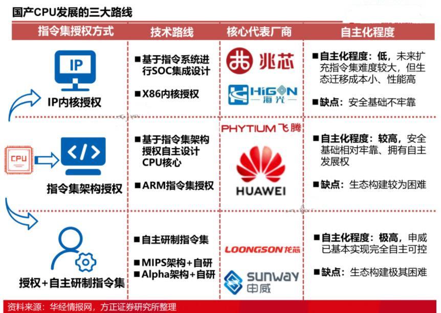 我们从这六大国产电脑芯片产品可以看出,实力最强则是华为鲲鹏920芯片,在2019年就达到了 7nm工艺制程水准,随后便是海光达到了14nm工艺水准,飞腾、兆芯也达到了16nm工艺水准,剩下龙芯、申威这两家芯片企业依旧停留在28nm工艺水准,而这六款芯片也采用了不同的芯片架构,有主流的ARM、X86芯片架构,也有MIPS、alpha架构;这也代表了目前国产芯片发展三大路线,分别是IP内核授权模式、指令集架构授权模式、授权+自主研制模式