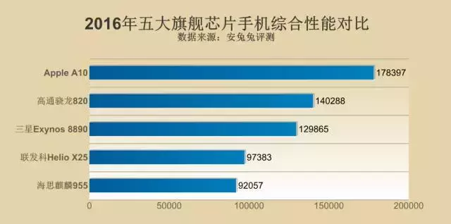 注:以下数据数据中的跑分成绩,分别来自魅族 Pro6(联发科Helio X25)、华为P9 Plus(海思麒麟955)、一加手机3(高通骁龙820)、三星Galaxy S7韩版(三星Exynos 8890)、iPhone 7 (Apple A10)。
