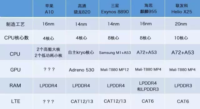 三星Exynos 8890使用的是自主核心+ARM核心。联发科Helio X25则走多核路线。麒麟955则是稳扎稳打,采用A72+A53这样较为成熟的架构。
