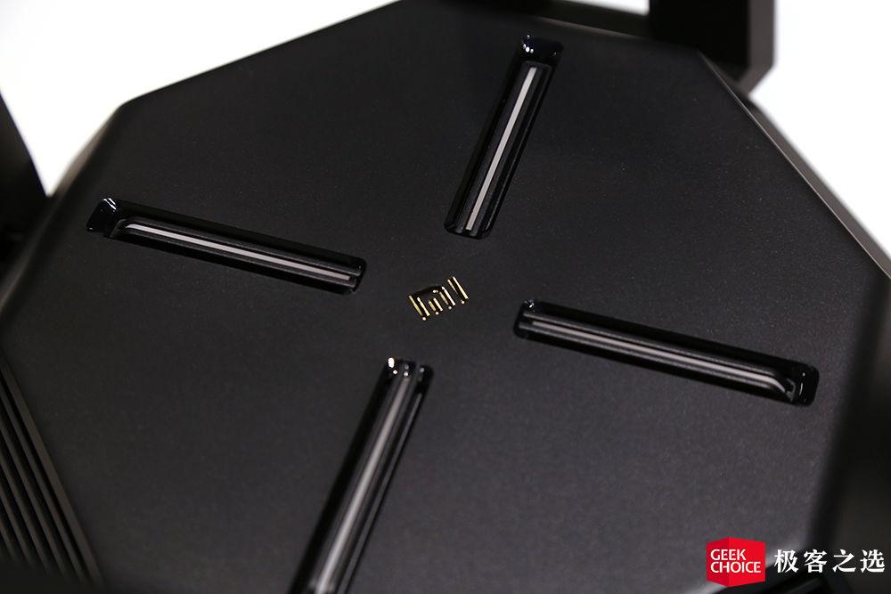小米路由器 AX9000 的主体采用了八边形的设计,正上方中心是小米的 logo,四周是呈「X」型分布的 LED 灯带每组灯带中包含 2 个 RGB 灯,最高支持 1670 万色,不仅仅是光效的配合,这些灯带本身也拥有状态指示灯的作用,在网络出现问题时是红色的,而正常状态下则是绿色的。它拥有电竞模式灯效和 5 种灯效可选。