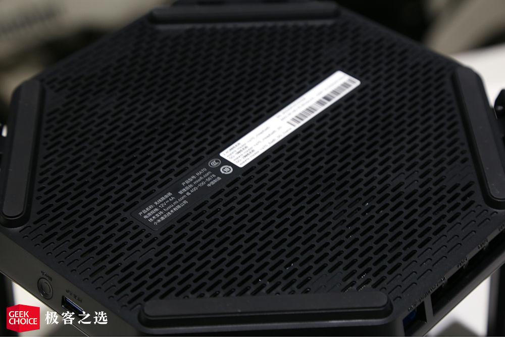 因为小米路由器 AX9000 采用了八边形的设计并且拥有四组天线,所以很自然的另外四个「边」就成为了其他功能安置地。小米路由器 AX9000 的正面拥有两个状态指示灯,左侧是 USB 3.0 接口和 Mesh 按钮,右侧是开关、电源接口和重置按钮,后方则是 1 个 WAN 口和 4 个 LAN 口的布局,其中 WAN 口支持千兆以上宽带接入,LAN 口理论速率最高可达 2.5Gbps,支持组建 NAS 进行局域网传输。比较不爽的是,网线和电源没在一个部分,所以视觉效果会有些凌乱。