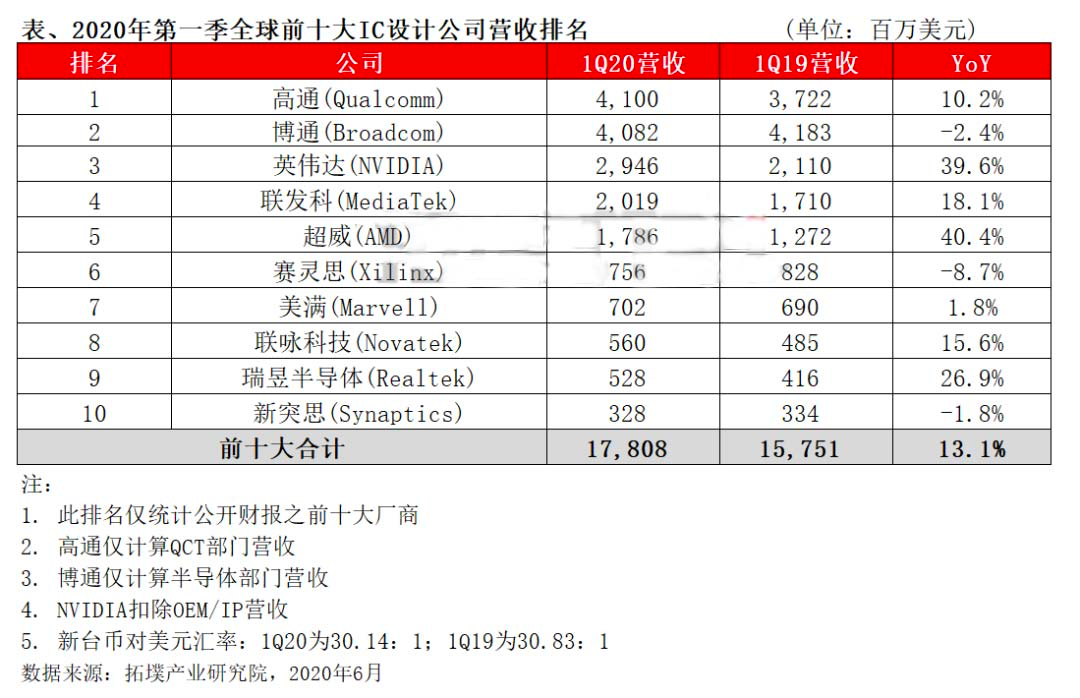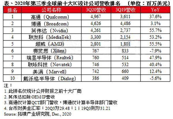 据拓墣产业研究院发布的排名显示,高通公司2020年Q3季度的营收规模达到了49.67亿美元,相比去年同期增长了37.6%,排名第二的则是博通,营收46.26亿美元,英伟达、联发科、AMD等则分别排在三四五位。