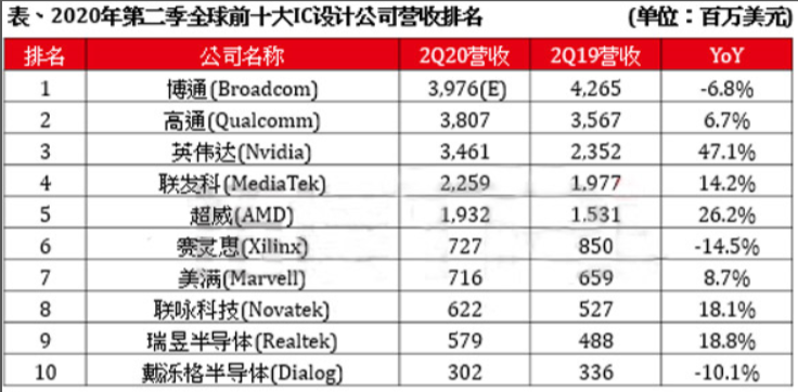 在2020年第二季度全球前10大IC设计厂商营收排名中,与第一季度相比,最大的不同就是榜首易主,博通从高通手中夺回了第一的位置。