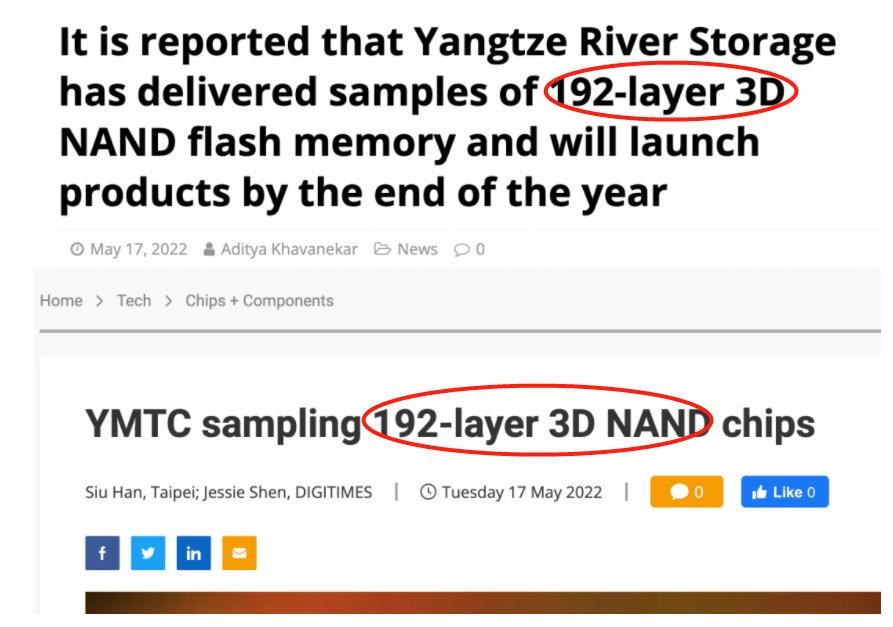 头一段时间,有媒体报道称,长江存储自主研发的192层3D NAND闪存已经送样,预计年底实现量产。