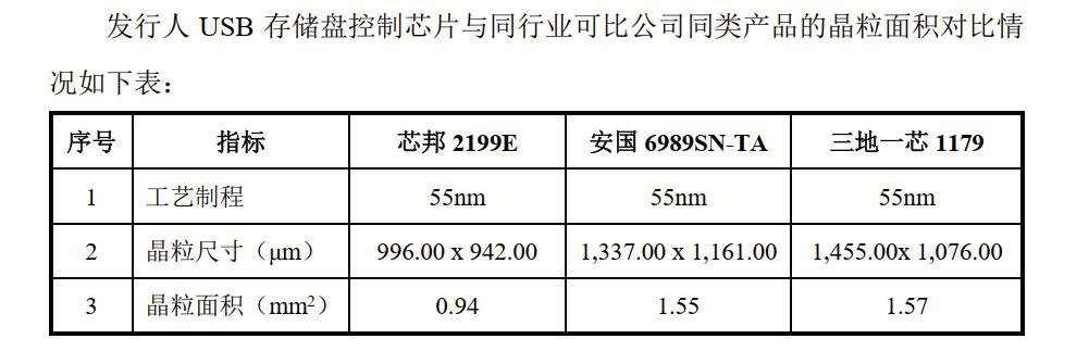 在USB存储盘控制芯片领域,同为55nm工艺制程下,芯邦科技2199E产品的晶粒面积仅为0.94平方毫米,而安国科技6989SN-TA、三地一芯1179可比产品的晶粒面积分别为1.55平方毫米、1.57平方毫米,大于芯邦科技2199E晶粒面积。
