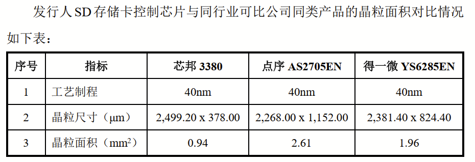 在SD存储卡控制芯片领域,同为40nm工艺制程下,芯邦科技3380的晶粒面积仅为0.94平方毫米,而点序科技AS2705EN、得一微YS6285EN的晶粒面积分别为2.61平方毫米、1.96平方毫米。