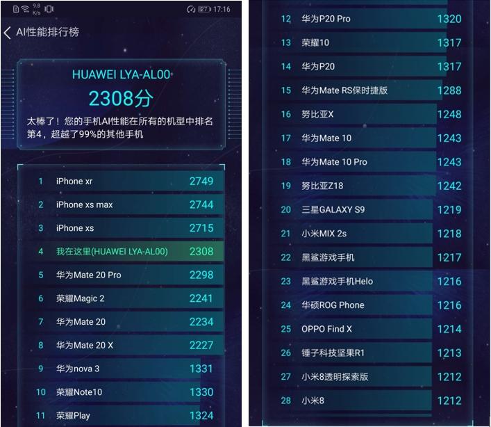 可以看得到麒麟980的AI测试分数达到了2308分,超过的99%手机,在安卓手机中绝对是顶尖水平。
