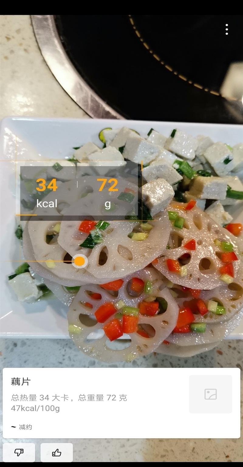 我们用日常食用的藕片来进行测试,虽然摆放很凌乱,但华为Mate 20 Pro依旧可以识别出食物名称,并根据重量算出食物的总热量为34大卡。