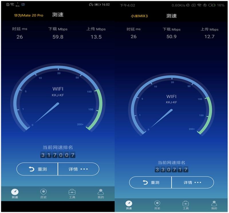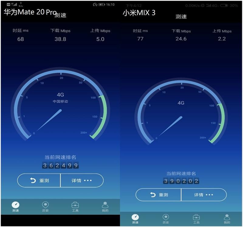 可以看出,Mate 20 Pro相比小米MIX 3具有更低的网络延迟,而且在下载速度和上传速度上更是比小米MIX3高出14Mbps。虽然是在相同的网络环境下,两款手机的通信体验却完全不同。