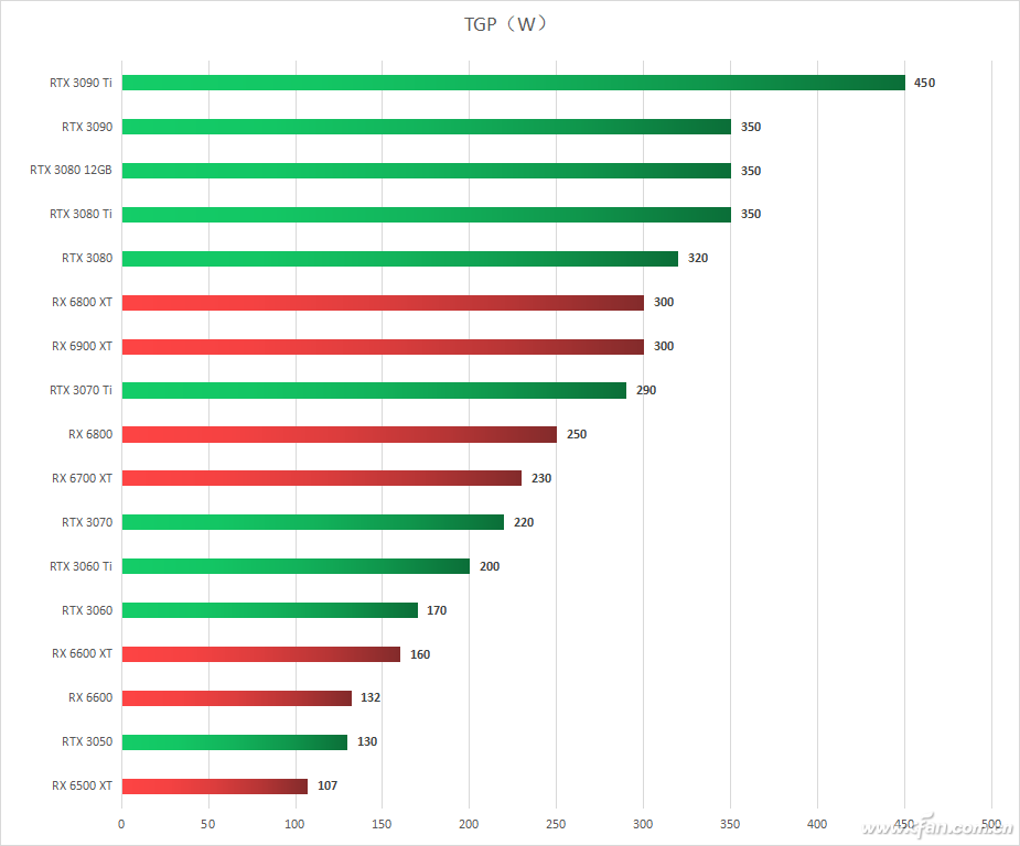 从这些显卡的TGP对比中可以看到一个趋势,那就是类似定位下,N卡的功耗要高一些,这与其更复杂的结构有关,而AMD GPU则采用了相对精简的架构,即使采用相当高的频率也可以相对节能。