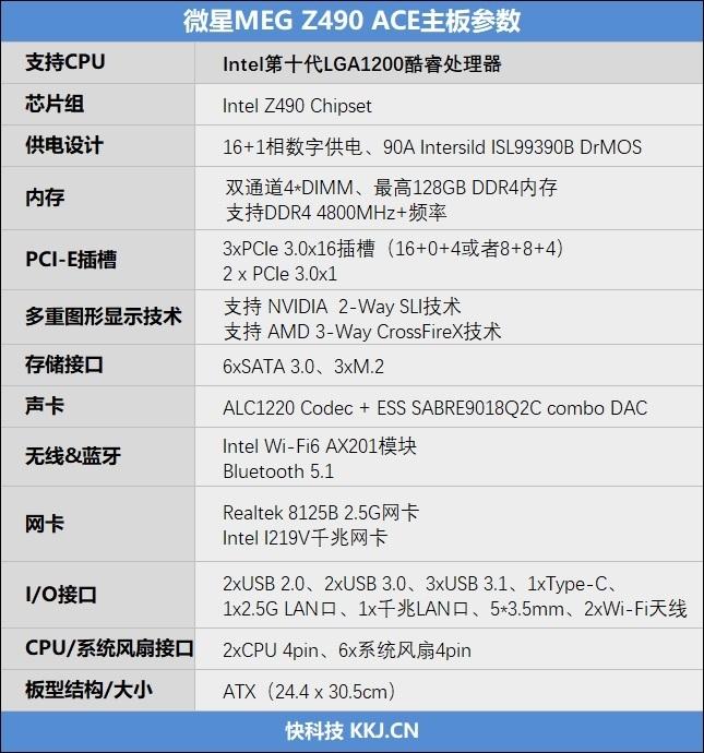 在其他方面,MEG Z490 ACE主板也都兼顾到了,Intel Wi-Fi 6 AX201模块、1Gbps+2.5Gbps的双网卡、3条全尺寸PCIe x16以及3个M.2接口等等这些都有。