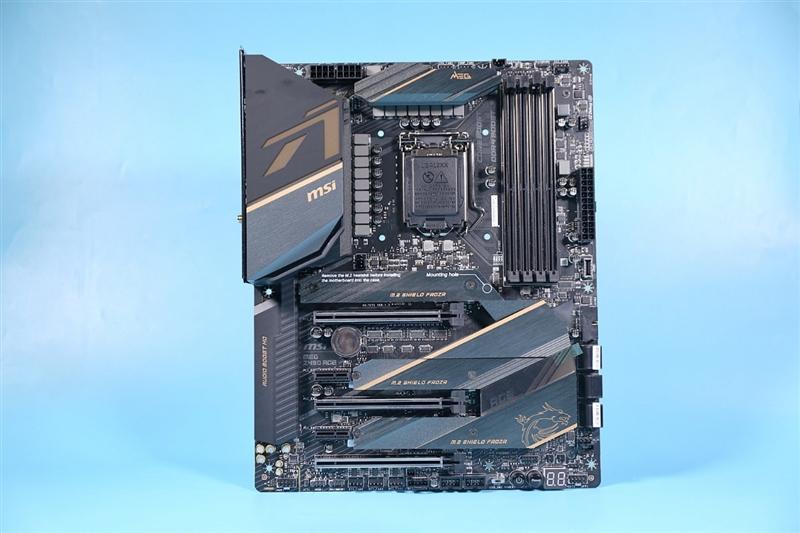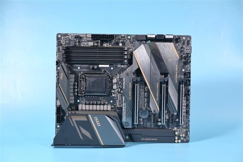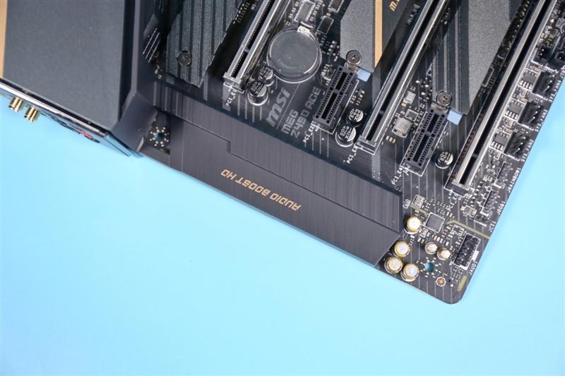 微星MEG Z490 ACE主板采用ATX标准板型设计,覆盖了大面积的散热盔甲,甚至覆盖了边缘的音频电路部分。