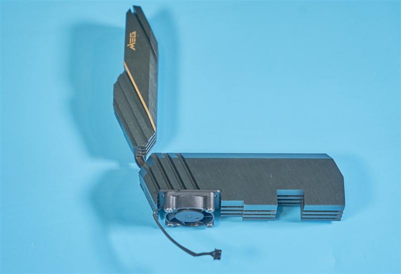 拆下VRM散热器之后还能看到上面安装了一个小小的散热风扇。2个散热器有一条铜管连接。