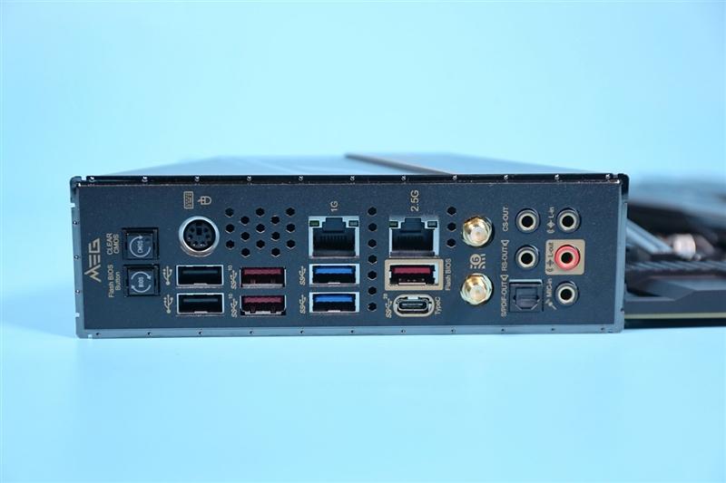 背部I/O接口,2xUSB 2.0、2xUSB 3.0、3xUSB 3.1、1xType-C、5*3.5mm、1xRJ45、2xWi-Fi天线口、1x光纤音频口、CMOS清空以及BIOS 回写按钮,没有视频输出接口。