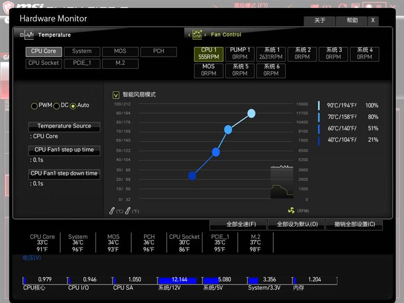 8个风扇都可以单独依据CPU、MOS、主板或者机箱内部温度来设置温度曲线。