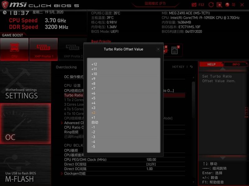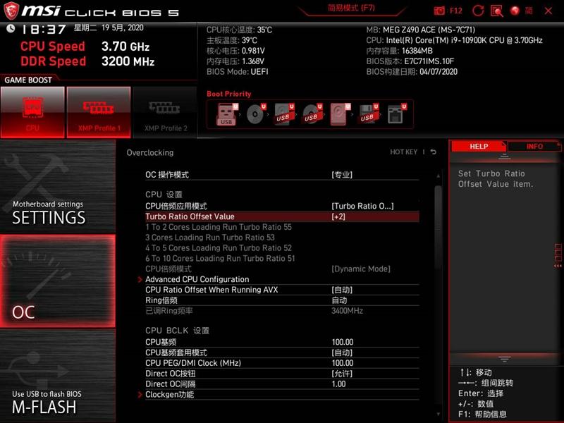 微星MEG Z490 ACE主板竟然默认就设置了+200MHz的频率偏移,也就是说不需要做任何设置,i9-10900K直接就可以达到全核5.1GHz。