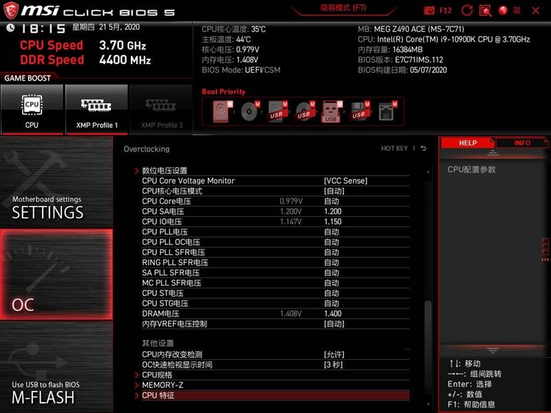 实际上也的确如此,在我们的实际测试中,MEG Z490 ACE主板能在1.4V的内存电压下将芝奇F4-3200C14D 8GBx2套装超频到4400MHz 18-19-19-39 CR2,而且人性化的BIOS设计让新手也能很轻松的超频内存。