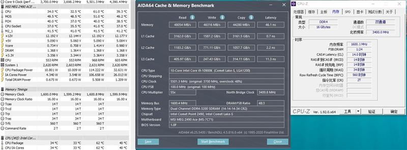直接在BIOS中打开XMP,内存的参数为3200MHz 14-14-14-34 CR2,使用AIDA64测得的读取、写入与复制带宽分别为48054MB/s、46316MB/s与44280MB/s,内存的延迟为46.1ns。