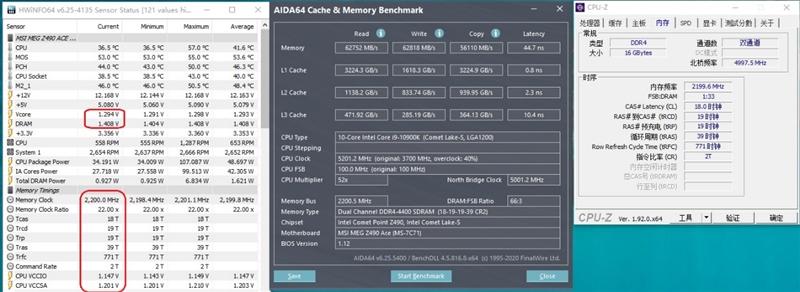 在内存超频这一块,MEG Z490 ACE主板也没让人失望。在BIOS里面“Memory Try it!”中选择DDR4-4400 C18选项,实际时序竟然是18-19-19-39 CR2,能在4400MHz频率和1.4V的电压下达成这样的时序并通过了内存稳定性测试, 的确是让人意想不到。