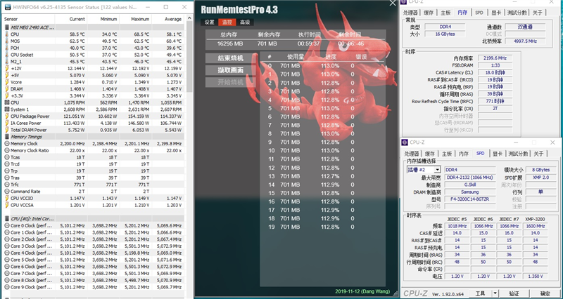 使用MemtestPro 4.3测试超频后的稳定性,由于时间原因我们只运行了1个小时,进度达到了113%依然是0报错。也证明了Z490 ACE主板将幻光戟F4-3200 C14D 8GBx2套装超频到4400MHz 18-19-19-39 CR2时能够稳定运行。