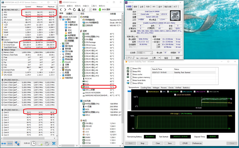 烤机测试进行了9分钟,在全核5.1GHz的情况下,处理器的烤机温度为84.5度,烤机功耗214瓦,主板供电模块的温度只有73度,VRM小风扇的转速为1762RPM。
