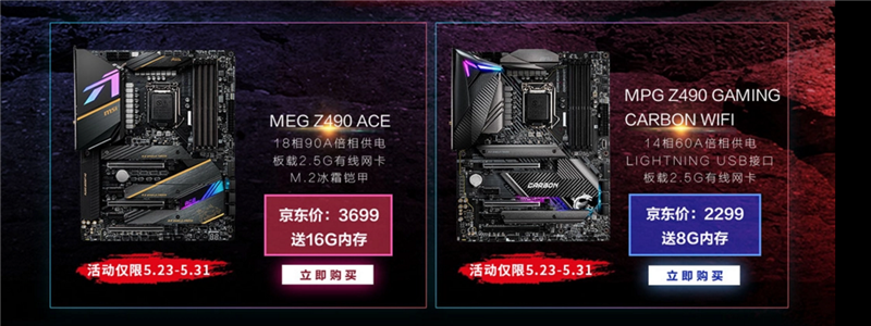 微星MEG Z490 ACE主板的报价为3699元,相比动辄万元的顶级主板而而言便宜了不少。在5月23日~5月31日之间购买还能免费得到16GB DDR4内存,此外,购买之后在官网晒单还能获得20美元的Steam游戏点卡。