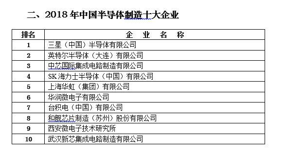 在5月17日召开的世界半导体大会上,中国半导体协会发布2018年中国半导体制造十大企业名单,三星(中国)半导体有限公司、英特尔半导体(大连)有限公司、中芯国际集成电路制造有限公司分别位列名单的前三位,其中前两者为外资控股。