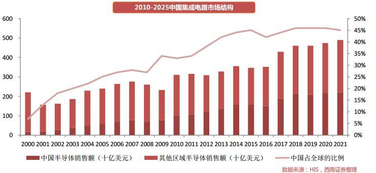 西南证券表示,中国芯片市场规模达到千亿美元,占全球芯片市场 50%以上,但过分依赖进口也是一大弊端。
