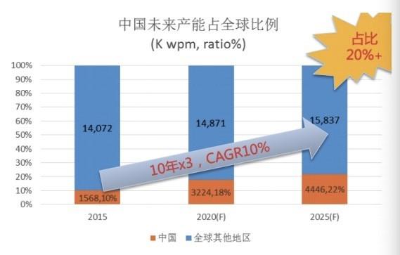 2015年-2025年中国内地半导体晶圆厂产能全球占比预测。 数据来源:中泰证券