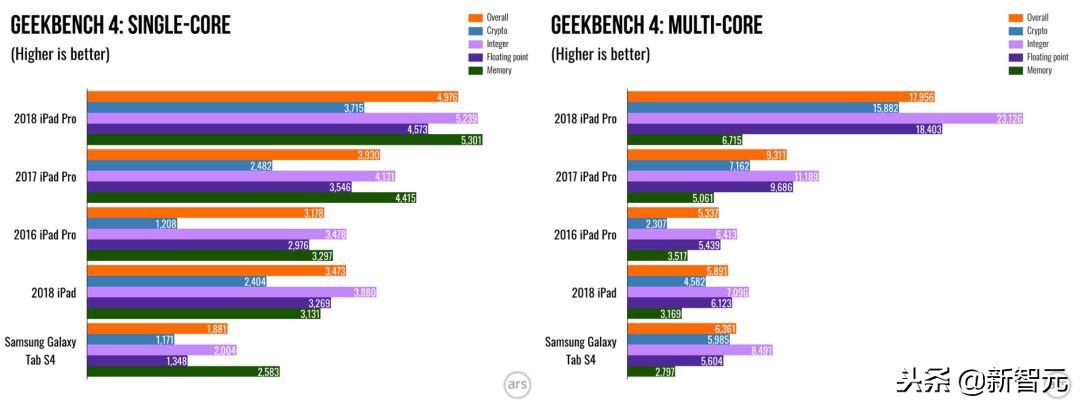 单核/多核,2018iPad Pro与以往iPad及三星Tab S4比较