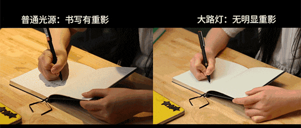 宝宝的眼睛对光线的明感度非常高,学习区域的光线不均匀就容易让眼睛酸涩,我在三款大路灯下分别体验了写字和阅读时的感受,说实话长时间使用眼睛的舒适度要比以前改善了很多,但当我在最高亮度下直视大路灯,带来的感受又有所不同。