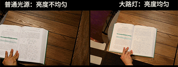 孩子在读书、写字等近距离用眼活动时,读写位置中间区域的光照强度应不低于 300 lux*。如果家庭照明不能满足需求,可以考虑大路灯来改善照明情况。 一台大路灯能同时达到 “吸顶灯 + 台灯” 的照明效果。 ?看下面的动图:打开大路灯后整个屋子都是亮的,没有强烈的“亮-暗“差异去刺激眼睛导致疲劳,同事在光下看书,就像在充满春日阳光的花园里一样惬意。 *来自国家卫生健康委近日印发《近视防治指南(2024年版)》的数据大路灯要怎么挑?