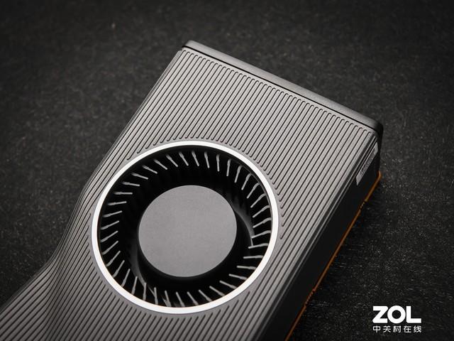 首先正面虽然和RX 5700一样使用了涡轮散热,但是有两点不同。第一就是外壳上面做了横纹处理,不易打滑,阻尼感明显加强。第二就是外壳上方有一块凹下去的印记,从正面看很像一个“7”。