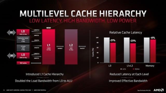 Navi还具有新的缓存层次结构。AMD为其增加了一个新的L1缓存,并将L0缓存的负载带宽加倍到ALU。新的缓存层次结构减少了每个级别的缓存延迟,并提高了有效带宽。