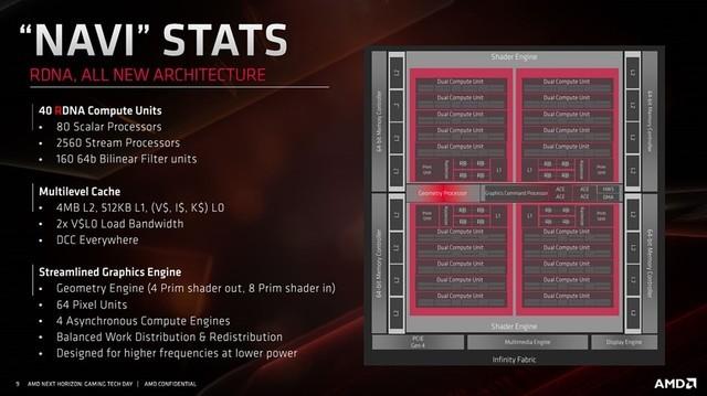 那么一块完整的RDNA架构里面都有什么呢?40个RDNA计算单元,包括80个标量处理器,2560个流处理器和160个64位双线性滤波器单元。GPU具有4MB L2缓存,512K L1和双倍V $ L0负载带宽,支持整个芯片的DCC(Delta Color Compression)。简化的图形引擎具有新的几何引擎,64像素单位和4个异步计算引擎。