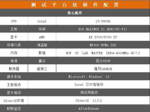 为保证此次评测能够发挥显卡的最佳性能,本次测试平台采用第九代Intel八核心十六线程的i9-9900K、ROG MAXIMUS XI HERO (WI-FI) 主板、影驰HOFOCLABMASTERDDR4-4000MHz 8GB×2 内存、鑫谷昆仑KL-650W电源、海盗船MP600 NVMe SSD固态、散热器为超频三偃月240RGB,详情请看下图。