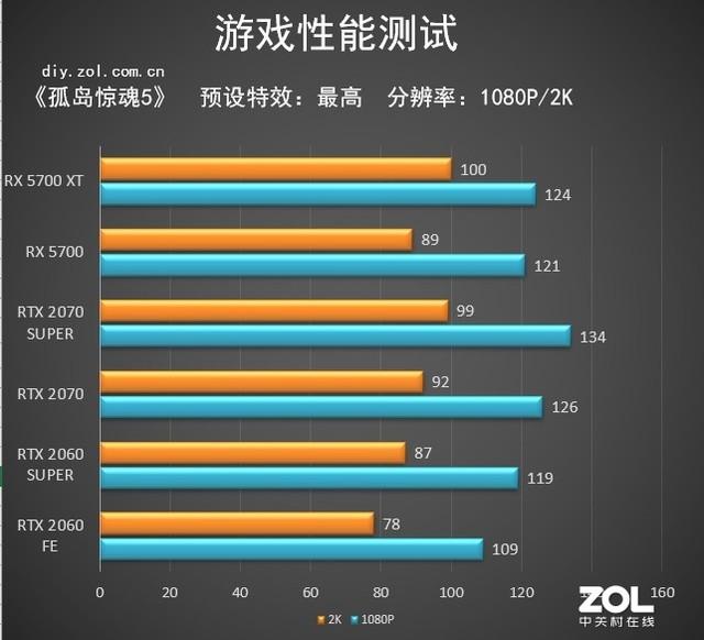 很有意思的事,我们得到的实际游戏数据和3DMARK理论测试差不多,不过有一些差异,这可能是测试驱动问题(毕竟AMD早期驱动,你懂得)。在DX11环境《孤岛惊魂5》中,RX 5700 XT只在1080P中没有跑过RTX 2070,在2K环境下甚至超过了RTX 2070 SUPER大约1帧左右。