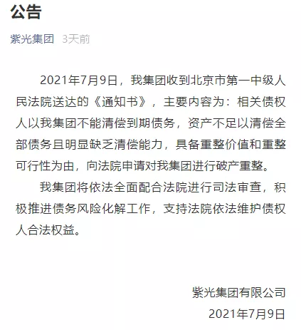 7月9日,紫光集团发布公告称,收到一则北京一中院送达的通知。