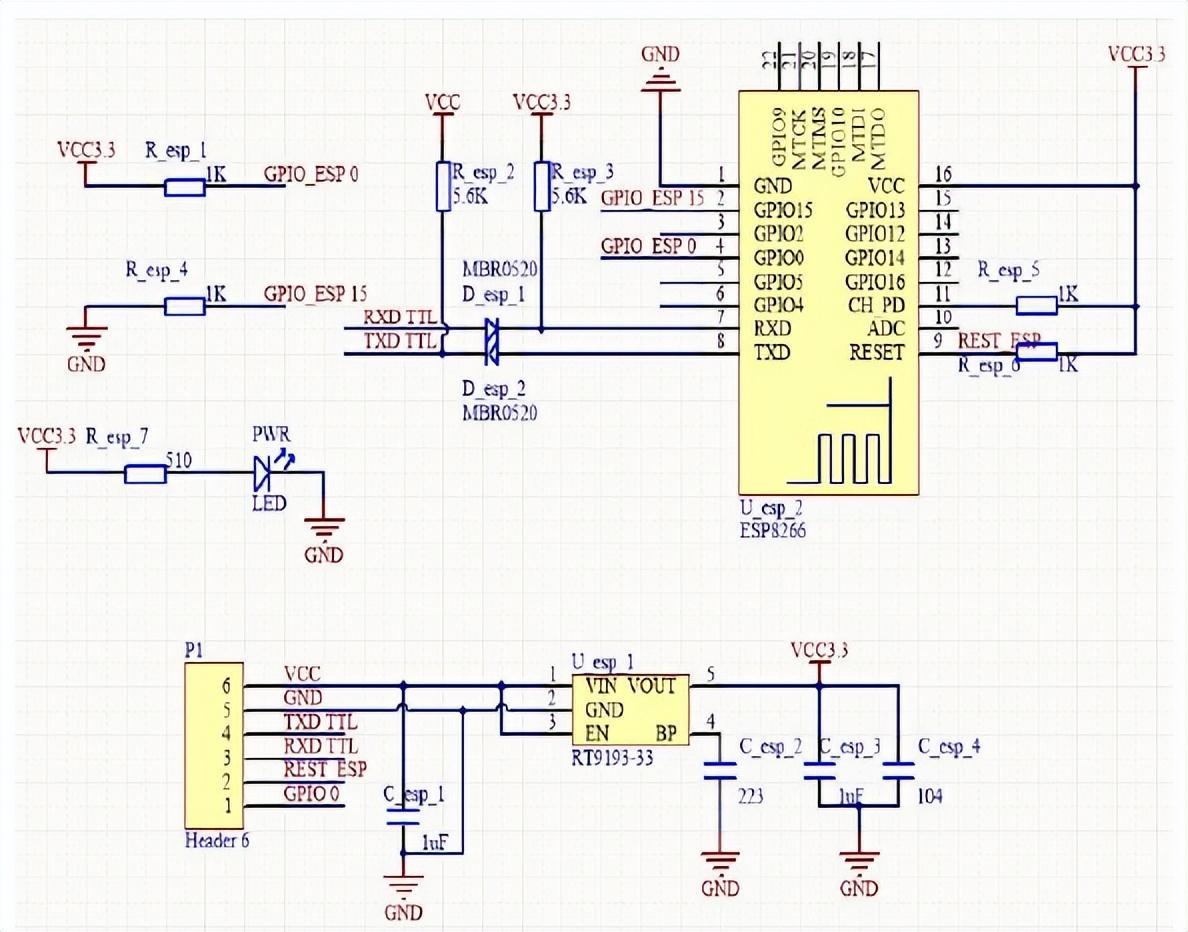 同时考虑到调试时可能使用的串口是TTL电平的,而ESP8266的工作电压在3.3V,所以将在芯片的RXD和TXD引脚处接上一个由二极管和上拉电阻构成的钳位电路,将其信号电压控制在3.3V,其中3.3V的电压将由稳压芯片RT9193-33实现,如图中RT9193-33