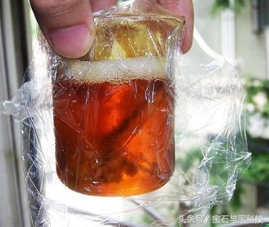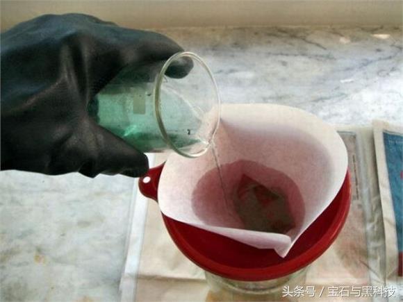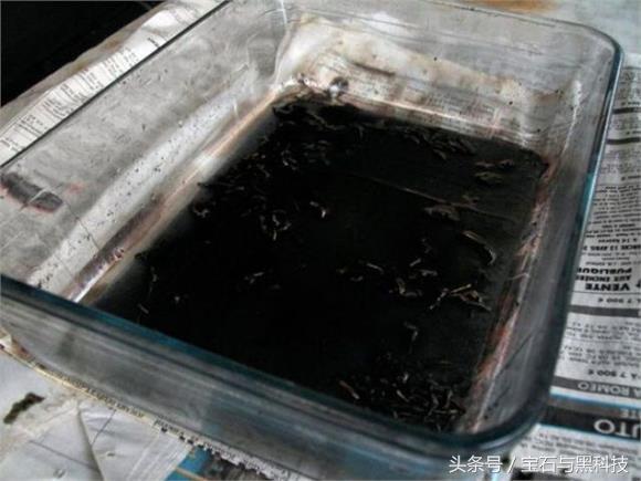 ·现在把滤出的金液冲洗出来,再往里面加一点82年的洗衣粉搅拌搅拌,可以看到金液在迅速变黑,这些黑黑的可都是钞票。