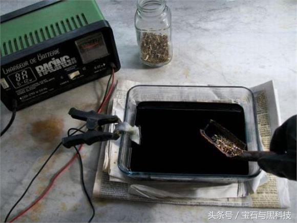 从这一步开始就有点吓人了。我们要通过电解的方法,恢复沉积在主板各种接口引脚上沉积的黄金。这里我们要规划一个电解池。里面倒满95%浓度的硫酸溶液,让物料在里面洗个澡。这些被电解的原料被放置在阳极。如图,我们已经形成了一个回路。