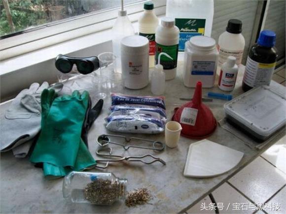另外呢,我们还需要一些必要的设备和化学药品。口罩、手套、护目镜这些是用来作自我防护的。镊子、钳子是用来拿捏原料的。还有滤纸是用来过滤提纯的。另外这里还涉及很多强酸类化学药品。下文会有更细的解释。