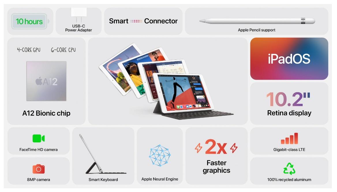 IT之家了解到,第八代 iPad 外观基本没变,配备了 10.2 寸大屏幕,采用 A12 仿生芯片,CPU 速度提高 40%,图形速度提升 2 倍。该平板配备了一颗 800 万像素的后置摄像头和 FaceTime 摄像头,支持 4K 视频拍摄。iPad 8 还搭载了双扬声器,Lightning 接口,续航时间可达 10 小时左右。