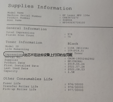这样就可以看到此W1110A硒鼓在本台打印机上的历史打印总页数了哦。