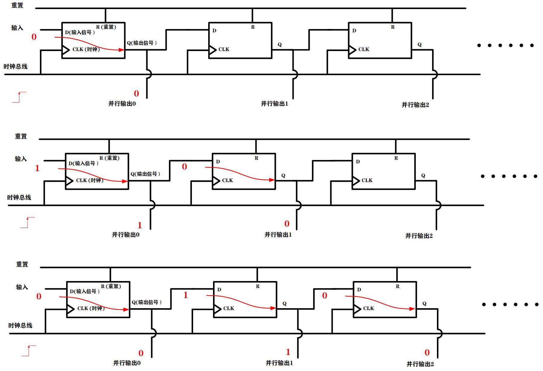 那么在以上的应用中,有细心的读者可能会疑惑:为什么在一个时钟上升沿(也即在时钟由0变为1的同时), 原来的输入只会到并行输出0,并行输出0只会到并行输出1, 而不会继续向下传递呢?