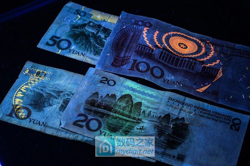20元人民币背面的绿色荧光只有在370nm以下波长的紫外线下才能显示出来