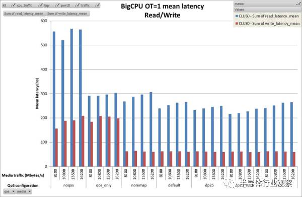 当中的表是DMC内部对QoS优先级的重映射。DMC500支持把某个模块的优先级提高,并动态调整。这里,CPU在每秒发送1.6GB之后,优先级会被降低,和外部总线一样。下图中,我们可以看到在没有QoS的时候,CPU的延迟最大(最左边noqos),有了QoS,由于CPU的优先级相对较高,延迟大大降低(qos_only)。而用了重映射之后,在1.6GB之下,延迟又进一步较大降低。