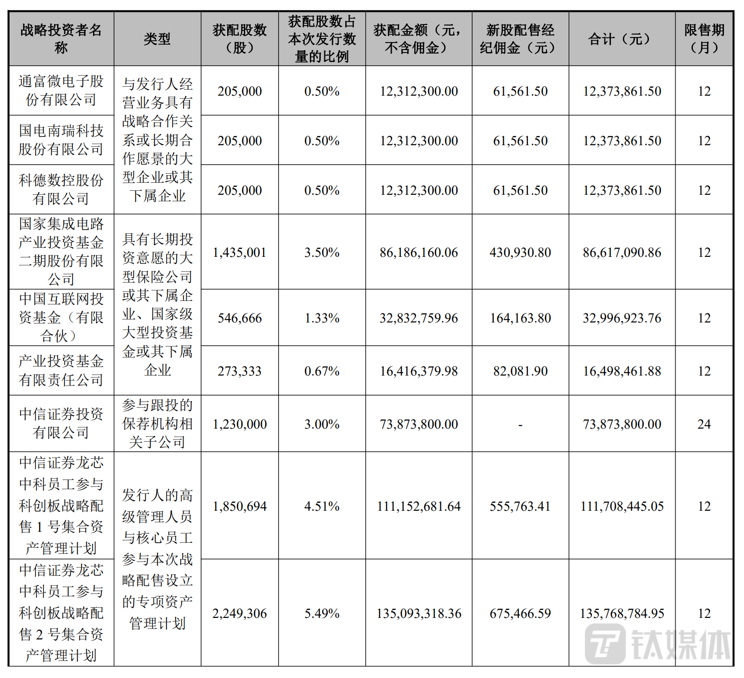 结果来看,大基金二期此次获配143.5万股,占此次发行数量的3.50%;中网投、产业投资基金分别获配54.67万股、27.33万股;三家产业界战略投资者各获配20.5万股。