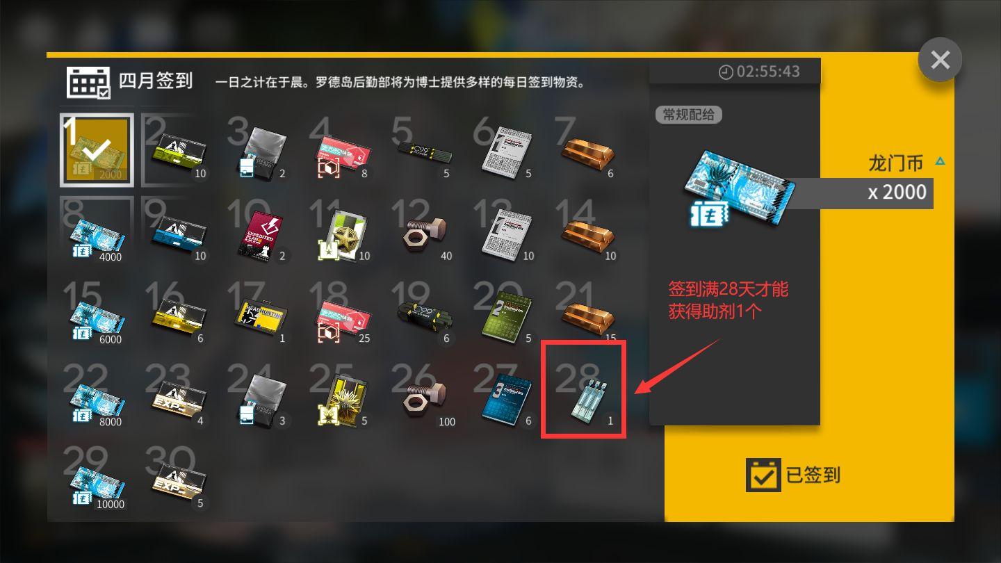 通过日常签到获得,也是一个重要的获得途径,对博士而言,一般,每日签到也是获得芯片助剂的一个有效渠道。但是,和上面的通过打剿灭作战一样,也是聊胜于无:通过连续28天签到,博士就能获得1个芯片助剂:
