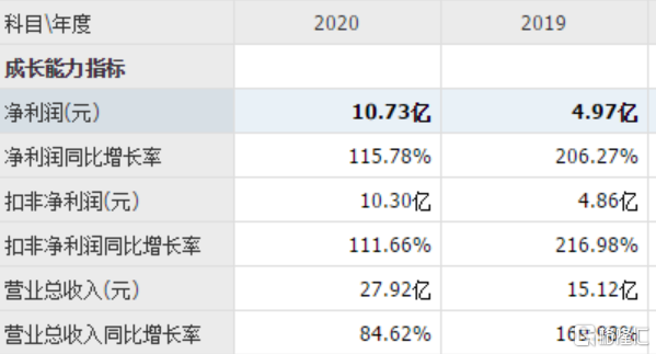 2019年,卓胜微实现营业收入15.12亿,同比增长169.98%;实现归母净利润4.97亿,同比增长206.27%。到了2020年,卓胜微营收继续大跃进至27.92亿,增长84.62%;净利润更是翻番至10.73亿元,增长115.78%。